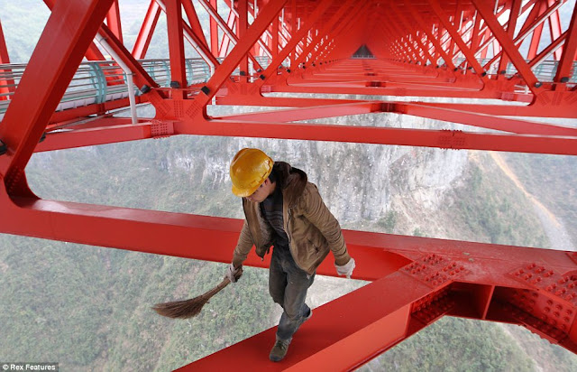 Satu kesalahan saja, pekerja jembatan berwarna merah sepanjang 1.176 meter di Jishou, Hunan, China itu akan mempertaruhkan nyawanya. Mana mungkin ia selamat jika jatuh dari ketinggian 335 meter.